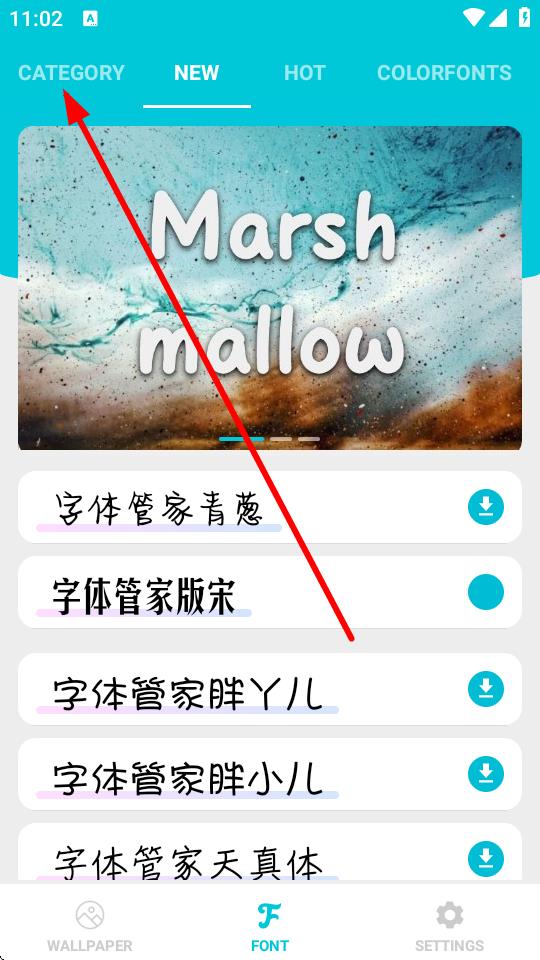 1、打开字体管家APP,点击顶部导航栏中的CATEGORY选项。