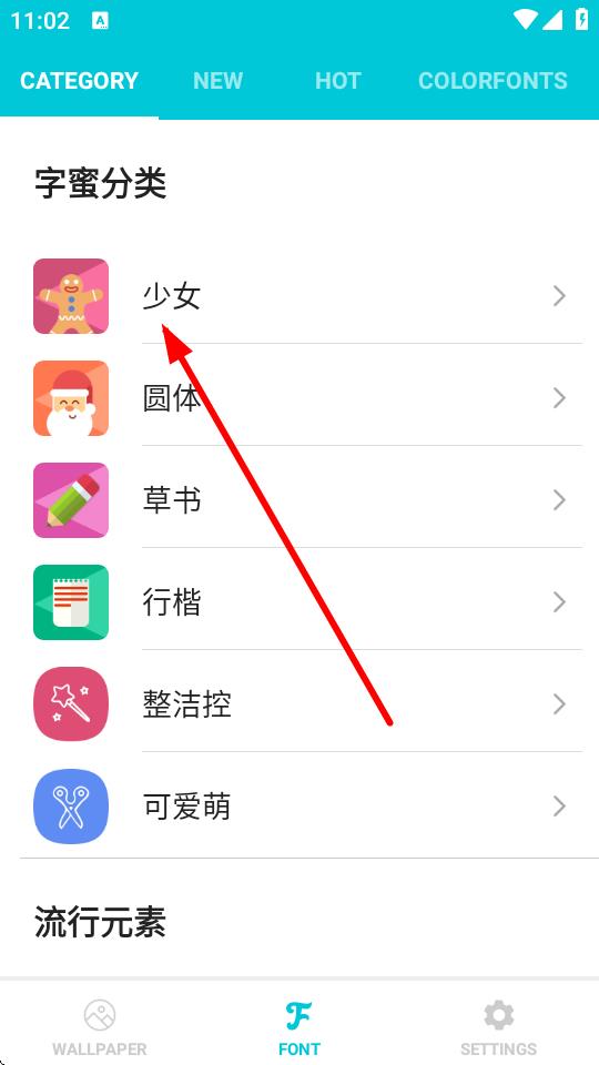 2、在字蜜分类列表中,选择想要下载的字体分类,比如点击少女分类。