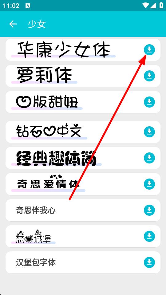 3、进入少女分类页面后,浏览字体列表,找到想下载的字体,点击其右侧的下载图标。
