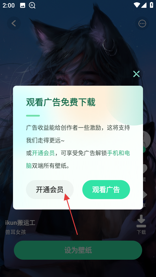 4、在弹窗中,可选择开通会员免广告解锁该壁纸设置。