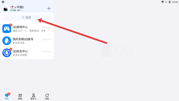 1、在qq的主页面中,可以通过点击搜索框进行搜索操作。