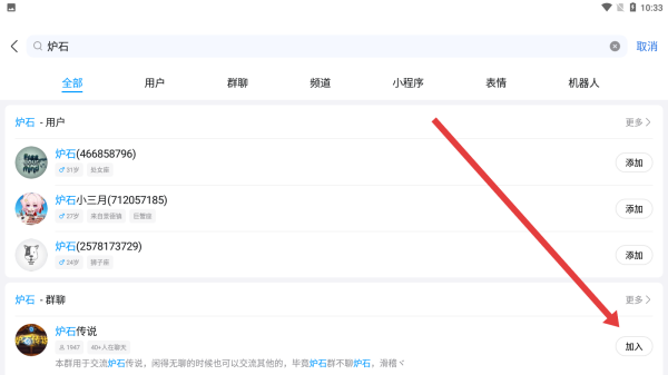 3、在搜索完词条后,在下面找到对应的群聊点击加入按钮,即可进入群聊。