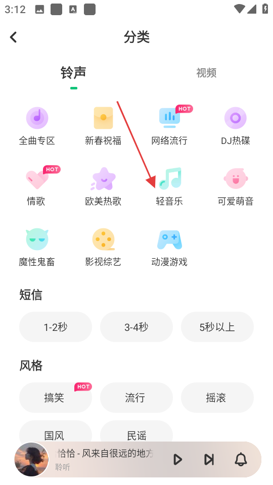 3、在分类专区,点击轻音乐分类,进入轻音乐列表。