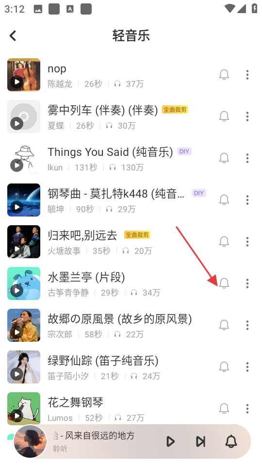 4、进入轻音乐列表后,选择喜欢的铃声,点击其右侧的铃铛图标即可设置。
