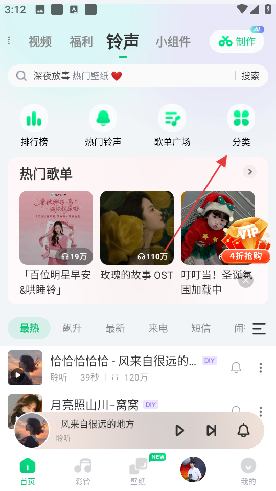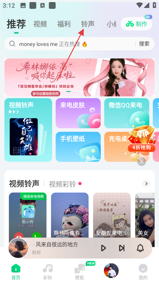 1、打开酷狗铃声,点击顶部的铃声选项。