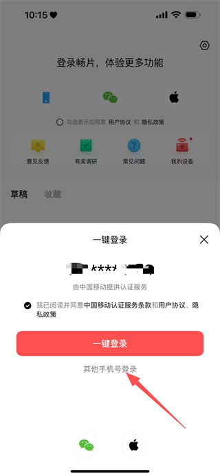 3、在登录选项弹窗中,点击其他手机号登录,进入手机号登录页面。