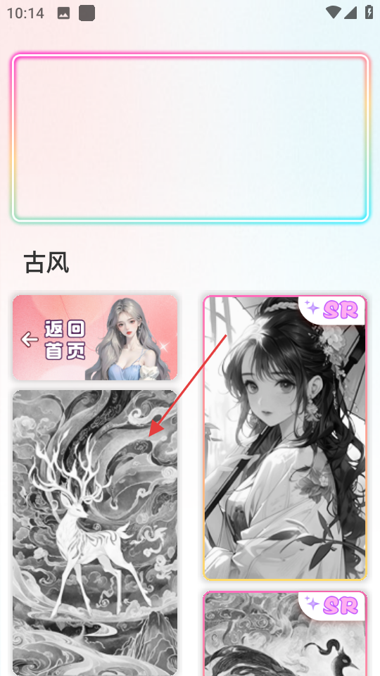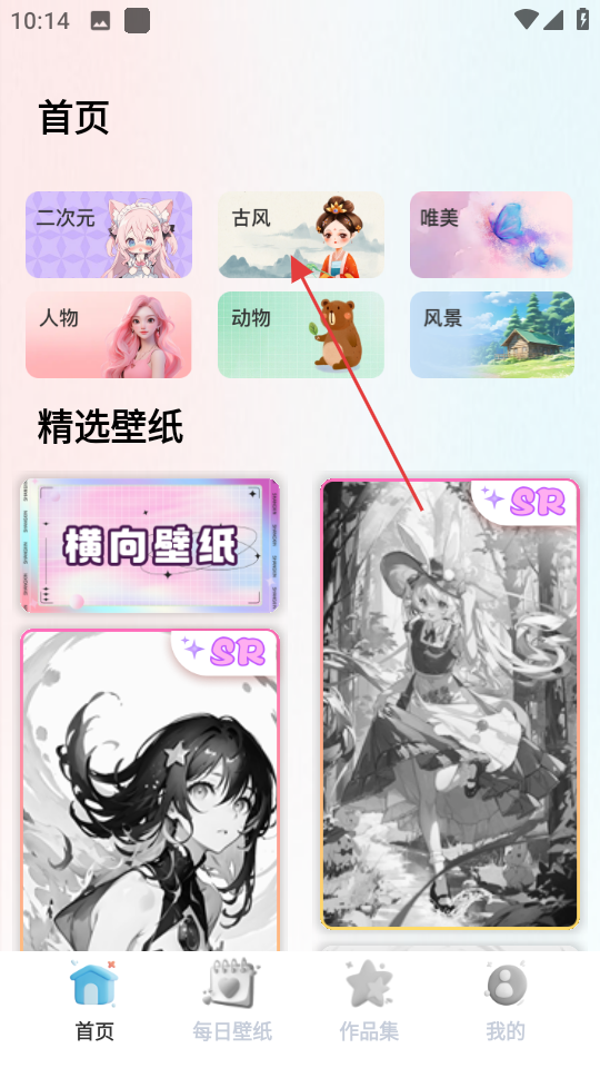 1、在首页,点击古风分类,进入古风壁纸展示页面。