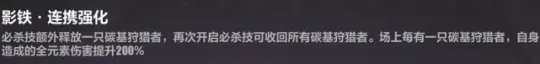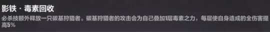 碳基狩猎者的攻击可以叠加【毒素之力】,并提升全伤害,也是一个非常好用的buff,可以和后面的【淬毒之刃】进行配合。获得非常高额的全伤加成,但就单buff而言,对sp回复的buff需求量大,但还是非常不错的。