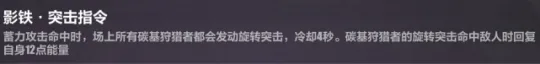 是一个辅助型的回spbuff,值得一提的是你可以利用蓄力攻击来控制碳基狩猎者的旋转,可以一瞬间打出超高爆发,但注意碳基狩猎者的位置呀。加sp的效果影响不算特别大,所以这个buff优先级略低。
