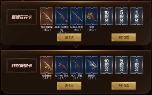 3、可以选择春暖花开卡或者非你莫鼠卡,再使用刮刮卡刮1次或者刮10次,即可看到你是否能获得道具或者兑换积分;