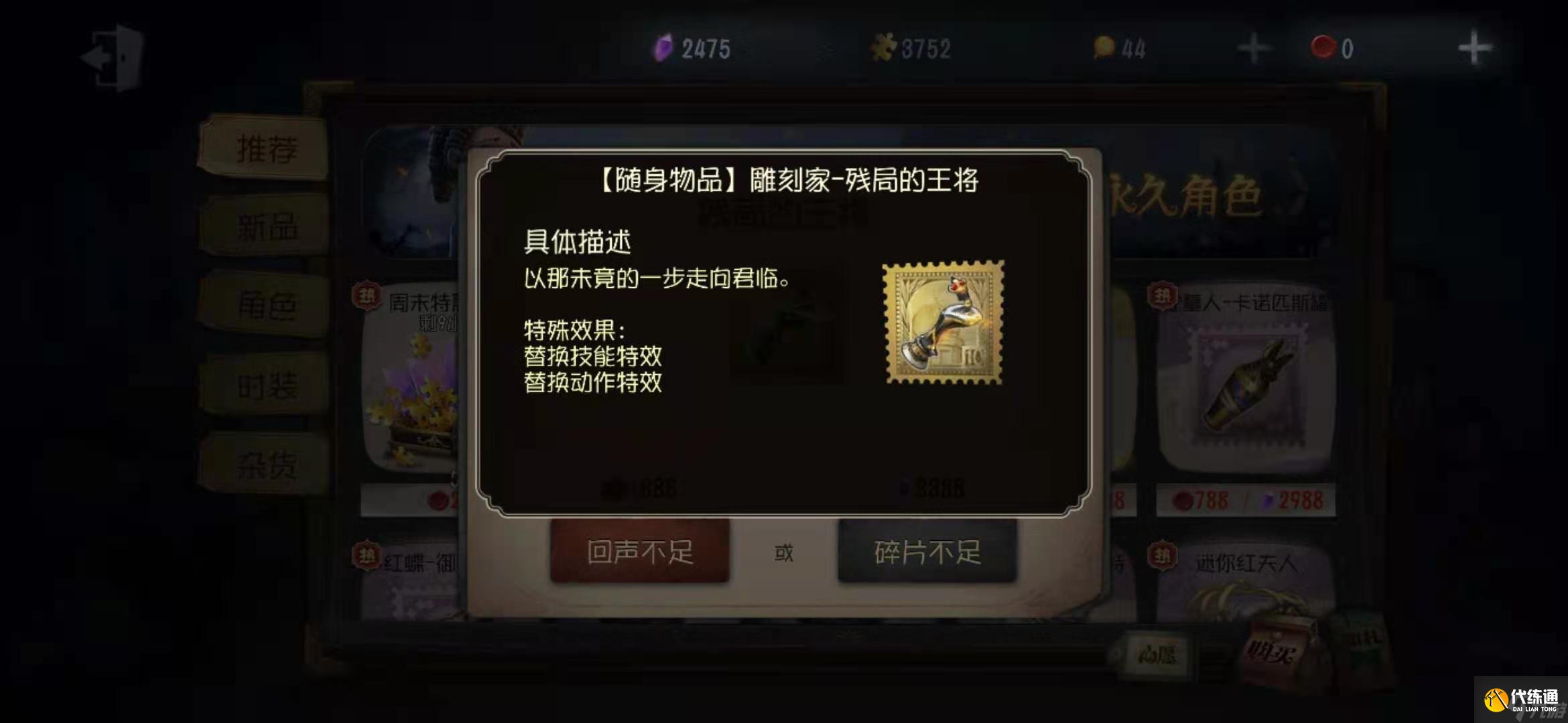 残局的王将,物品的具体描述为“以那未竟的一步走向君临”。监管者雕刻家在装备该物品后会替换技能特效和替换动作特效。物品残局的王将在商城直售,价格为1888回声和8388碎片,作为一个金挂,这样的价格还算比较合理。