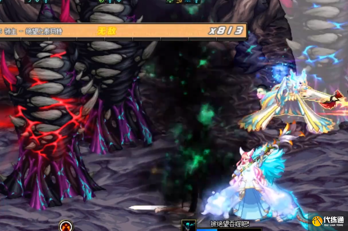 打完德斯佩罗后,我们便会遇见领主泰马特。它会将披风插入地面,并追着玩家抓取,躲避即可。还会将玩家困入蚕茧中,攻击蚕茧会出现颜色,红色的不要打破,记得要打破绿茧,打破后即可解救队友,接着把蓝色茧都刷掉即可。破茧速度跟攻击次数有关,与伤害无关。所以记得切换攻速快的装备去攻击。