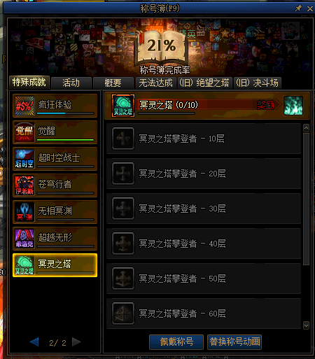 每通关10层冥灵之塔,可以通过称号薄获得称号奖励(以角色为维度,第一次通关可获得)