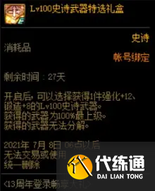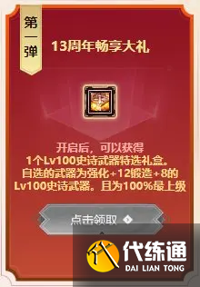 周年庆登陆第一弹奖励为一把强化12锻造8的100级自选武器(这把武器选择出来的品级为100%最上级,即黄金品级调整箱调整后的状态)