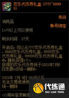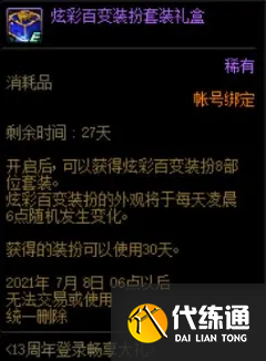 炫彩百变装扮套装礼盒打开后为一个期限为30天的8件套装扮,每日凌晨6点刷新装扮外观。这个可以当做是周年庆的小彩蛋,随意大家分配。