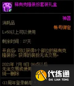 稀有克隆装扮也可以给偷跑到100级的刃影角色,但是偷跑的刃影角色会损失刃影预约活动“刃影之歌”中“刃影成长记”的所有道具,包括本职业光芒圣痕护石随机礼盒、远古的黄金增幅书等,玩家需根据自身需求权衡利弊分配。注意,以目前得到的消息,未满级的女鬼剑角色无法绑定刃影预约活动,且稀有克隆装扮礼盒需要50级才能开启,因此想要现在给刃影偷跑的勇士可以在女鬼剑50级后打开透明天空礼盒,然后在达到100级后绑定7月8日开放的刃影预约活动,活动的奖励损失与直接绑定满级刃影角色相同。