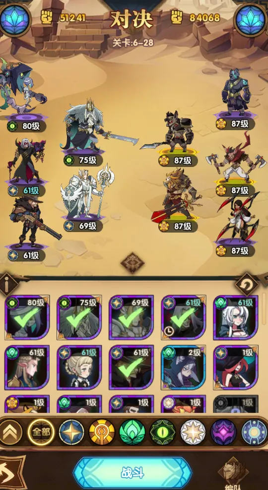 在第二天的努力中,小编也是冲到了6-28关卡,而这个关卡就比较难打了,对面高达8.4万的战力,真是碾压了小编。
