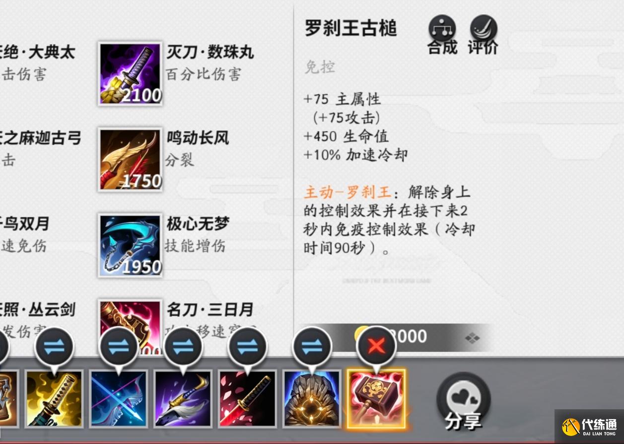 最后一件装备罗刹王古槌,可以解除身上的控制效果,并在接下来的2秒内免疫控制效果,虽然有冷却时间,但是在后期还是实用性很强的一件装备。