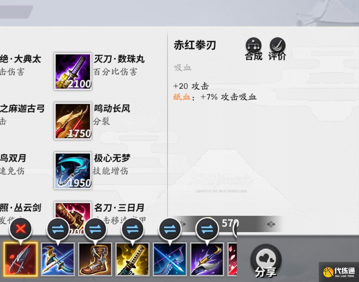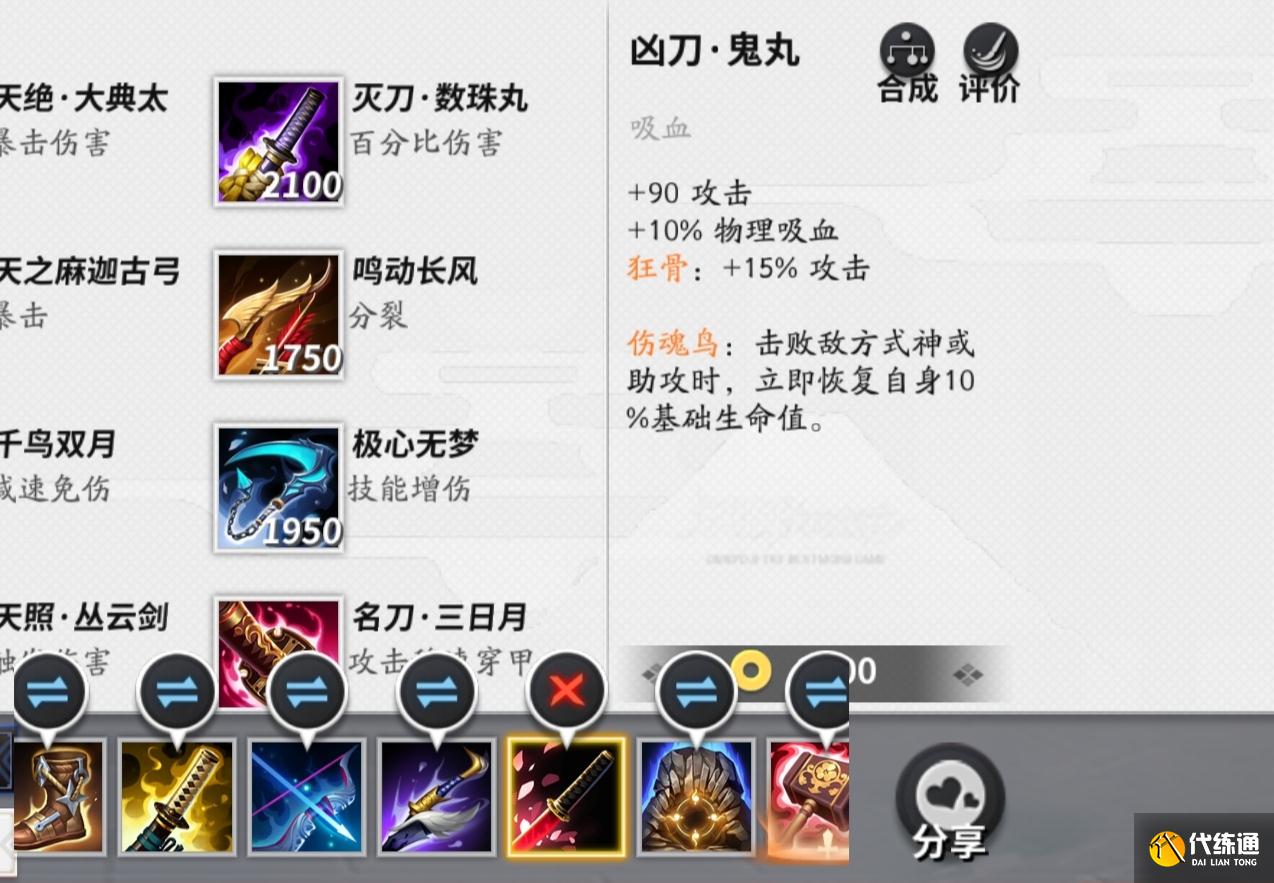 第七件装备凶刀鬼丸,附带物理吸血,可以增加90点攻击,在击败敌方式神或者获得助攻时,可以立即恢复自身10%的生命值。