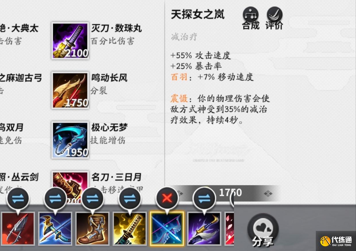 鬼刃鹤丸可以增加攻击以及物理穿透,作为第六件装备,可以增加式神中期的作战能力。