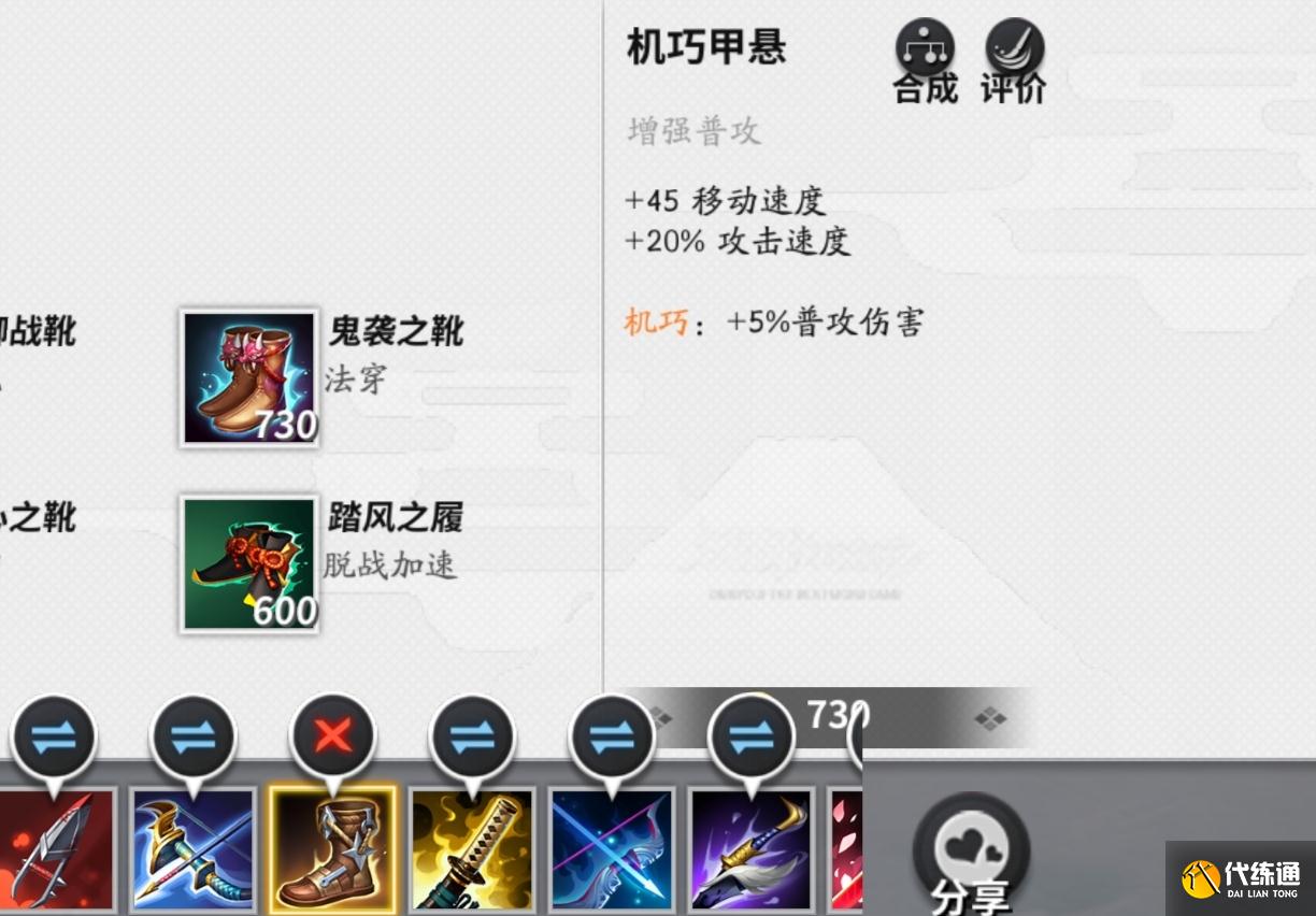 第三件装备机甲巧悬作为增加速度的鞋子,可以在增速的同时,增加5%的普攻伤害。
