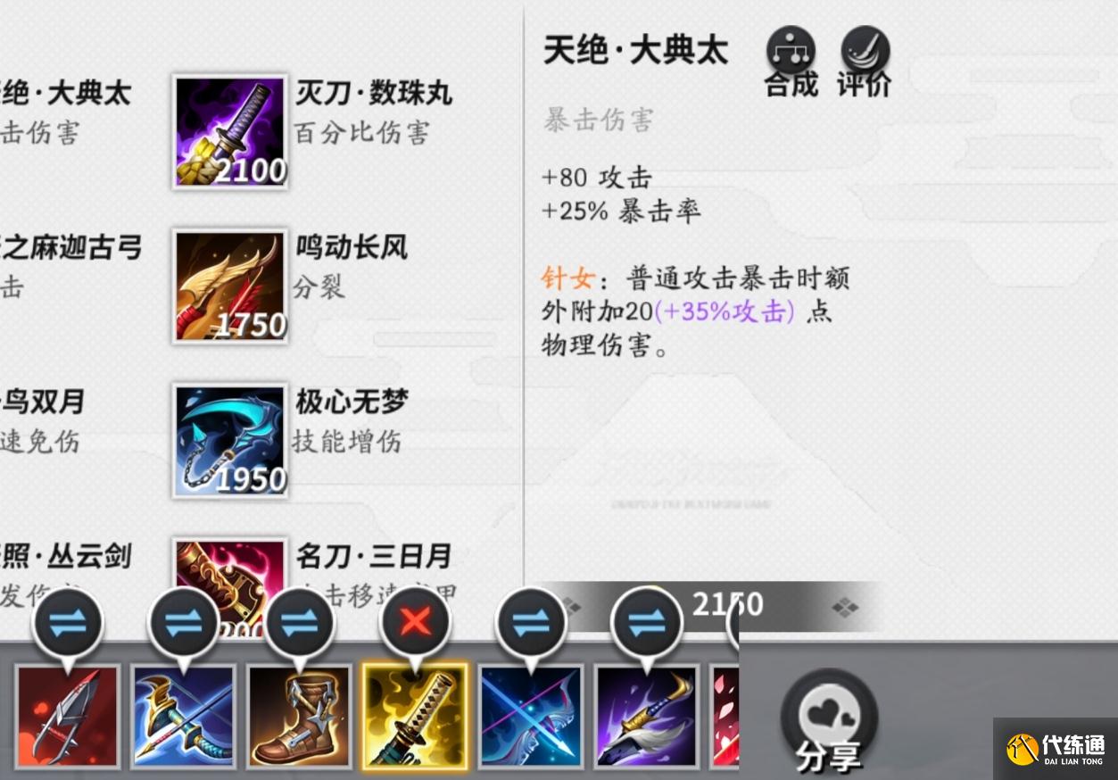 第四件装备天绝大典太,可以为式神增加攻击以及暴击率,其自带效果针女,可以在普攻暴击时额外附加物理伤害。