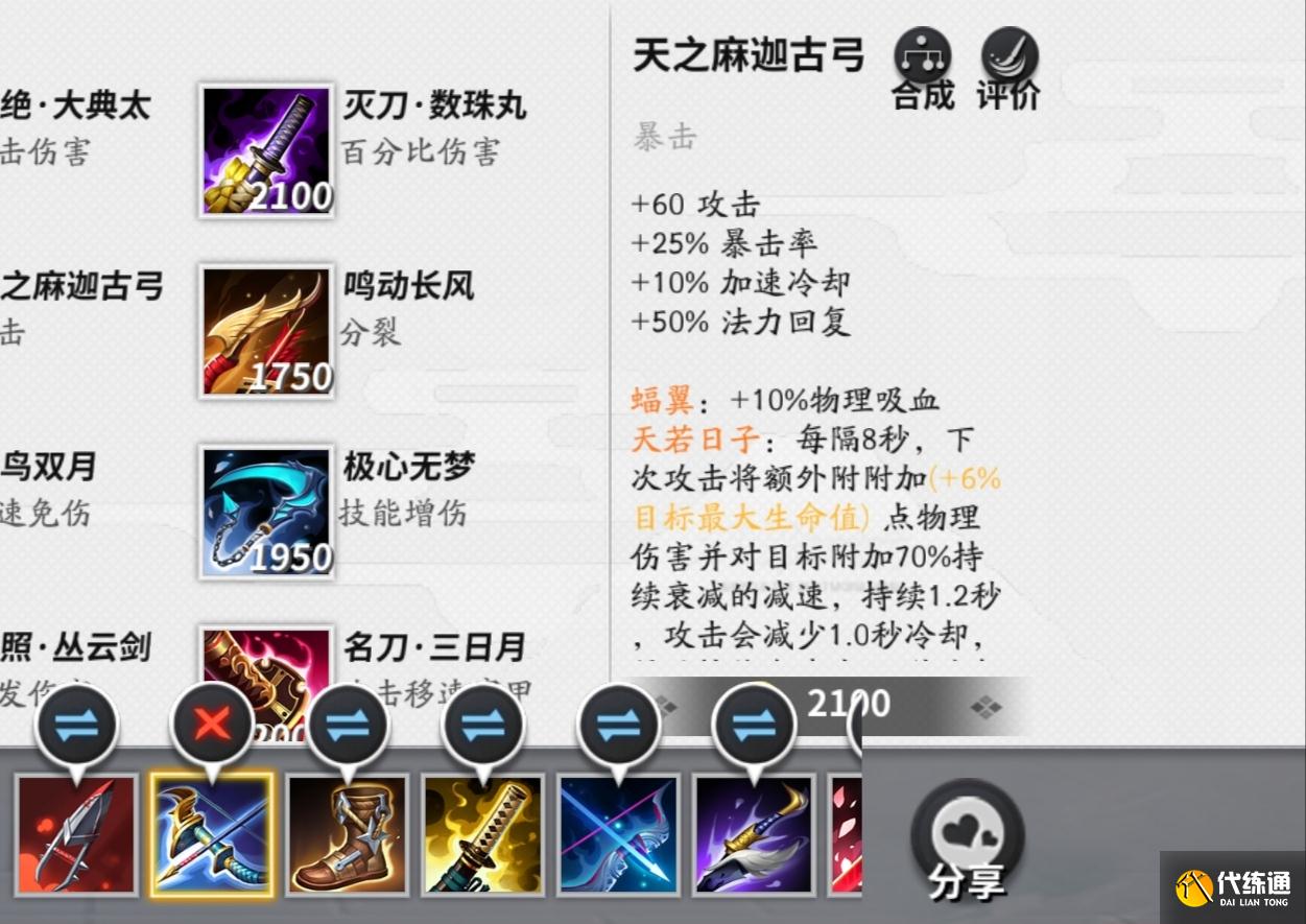 天之麻迦古弓作为第二件装备,可以增加攻击、暴击率、加速冷却以及法力回复。与此同时,还能增加10%的物理吸血,天若日子还能每隔几秒钟时间,在下次攻击中额外增加物理伤害以及持续衰减的减速效果。