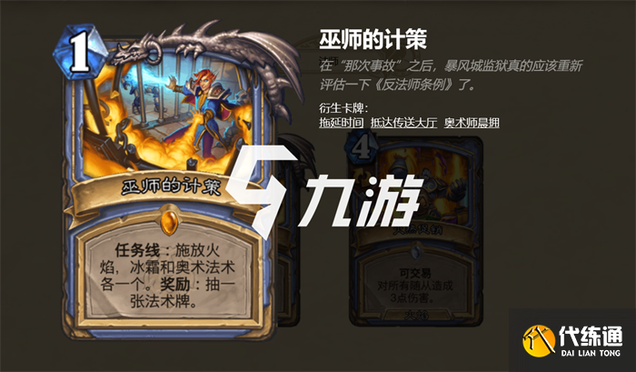 二阶【拖延时间】任务线:施放火焰、冰霜和奥术法术各一个。奖励:发现上述派系中的一张法术牌