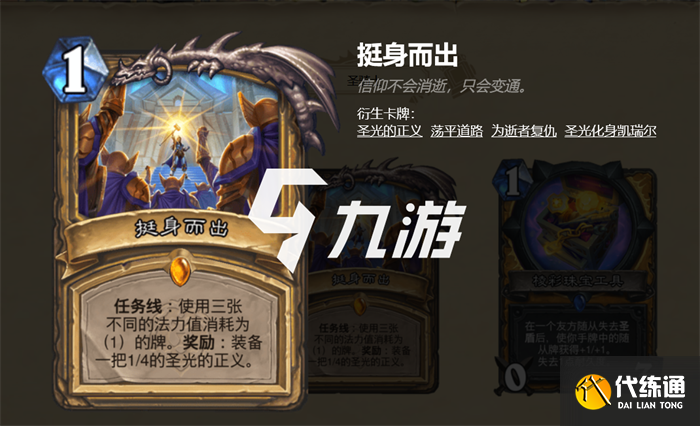 三阶【为逝者复仇】任务线:使用三张不同的法力值消耗为1的牌,奖励:圣光化身凯瑞尔