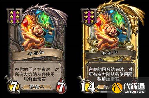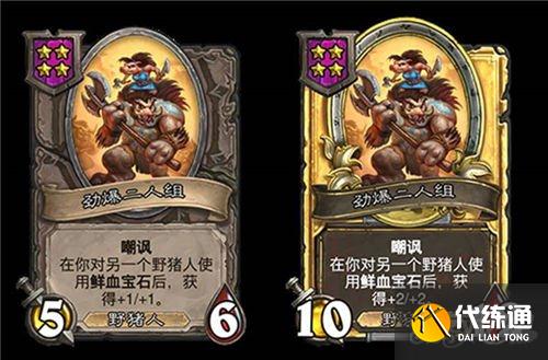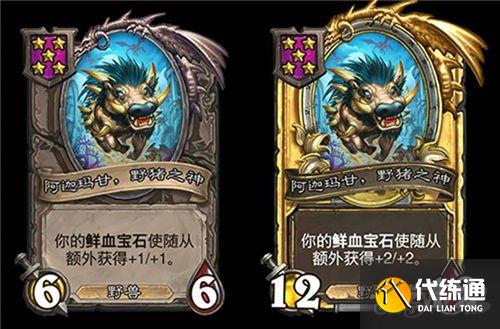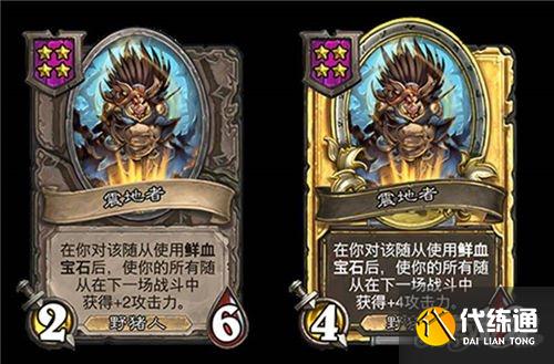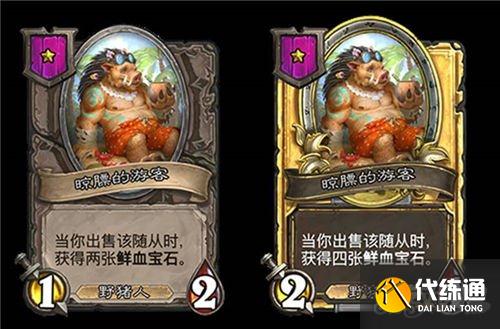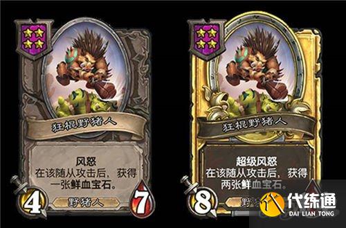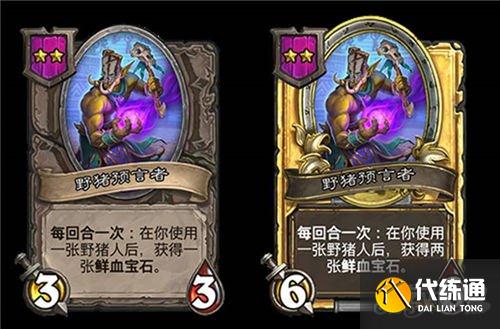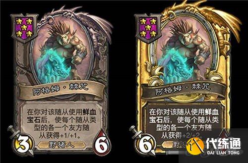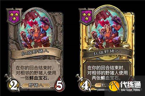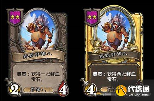 5星3/6,野猪人,在你对该随从使用鲜血宝石后,使每个随从类型的各一个友方随从获得+1/+1。(金色+2/+2)