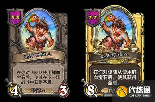 2星4/3野猪人,在你对该随从使用鲜血宝石后,使其在下一场战斗中获得圣盾。(金色一劳永逸地获得圣盾)