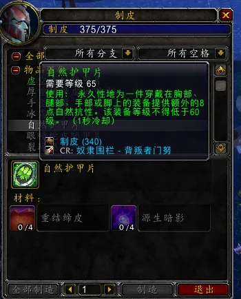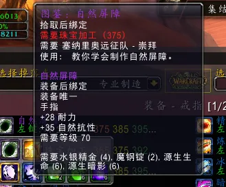 戒指:珠宝专业制作的自然屏障,图纸需要塞纳里奥远征队声望崇拜。以上5件加上附魔也有255点抗性了,胸腿手鞋4个部位可以使用自然护甲片,这样就287点了,加上到时候的buff与图腾,随随便便弄到375。其余部位穿戴自己平时的装备即可。
