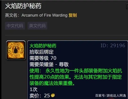 附魔及其他:头部附魔选择荣耀堡/萨尔玛声望尊敬可以购买的火焰防护密药,可提供20点火焰抗性。到这里已经有300点以上的火焰抗性了,如果恶魔天赋进本还有携带地狱犬的70全抗,或者搭配骑士萨满的火抗增益效果70点,或者术士自己也可以找制皮做一些烈焰护甲片来查漏补缺,把总抗性堆到365点满抗性之上。