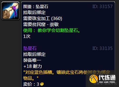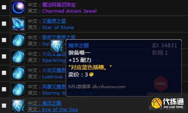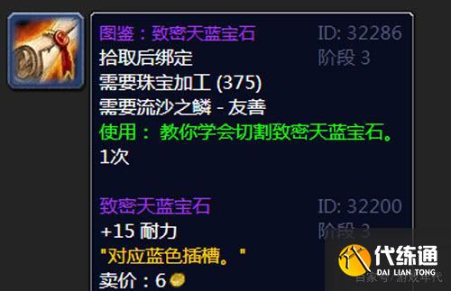 这个提升15耐力的宝石名叫“海洋之眼”,拍卖行卖价很贵,有的大服已经炒到1000金了。然而这个东西确实值这个价,蓝色宝石中,耐力加成达到或超过15点的只有3种,第1种就是这个海洋之眼,第2种名叫致密天蓝宝石,第3种则是坠星石。然而,致密天蓝宝石需要到P3阶段才能制作,因为原材料是黑暗神殿和太阳井小怪掉落,现在是弄不到的;坠星石则只有珠宝专业才可以使用,因为它拾取绑定,而且坠星石装备唯一,也就是一身装备只能插1个坠星石,提供18点耐力。