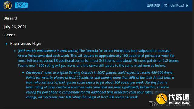 在最新的蓝贴中,暴雪表示将会在服务器维护之后提升竞技场奖励,具体的奖励规则就是玩家每周可以获得更多的竞技场点数,具体到数值就是5V5可以额外获得100点竞技场点数,3V3可以额外获得88点竞技场点数,2V2可以额外获得76点竞技场点数。