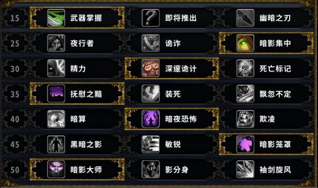 1、天赋选择,如下图,分别是武器掌握、暗影集中、深邃诡计、抚慰之暗、暗夜恐怖、暗影笼罩、暗影大师。