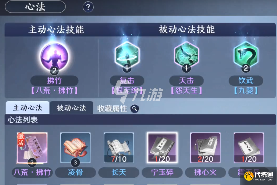 6.心法能为角色带来重要的属性加成,新手期系统会赠送紫色的主动心法,然后通过做任务还能得到一本蓝色被动的,先升级这两本心法然后再去收集收集其余心法,对提升战力也很有帮助。