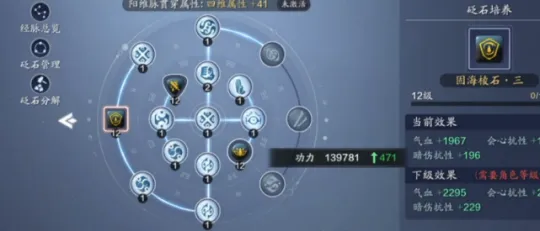新增一个新的方的棱石孔,12级砭石需要差不多7组绿色石母,金色方石是三种砭石里提升最大的,可以获得471点功力,经脉总共获得634点功力。