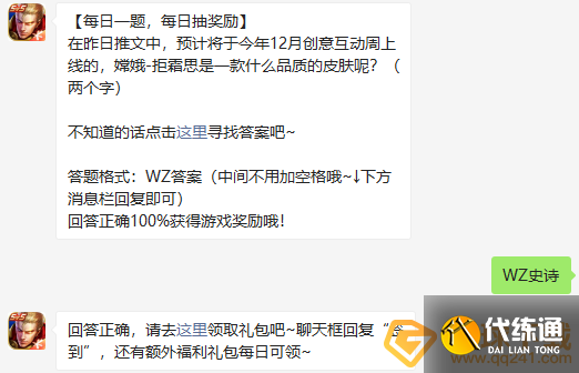 预计将于今年12月创意互动周上线的,嫦娥拒霜思是一款什么品质的皮肤呢?这是《王者荣耀》今天为你带来的最新的每日一题的问题,相信很多小伙伴对这个问题还不是太了解,这里小编为你带来了《王者荣耀》2021年微信8月26日每日一题答案分享的全部内容,喜欢的小伙伴欢迎点击预览哦。