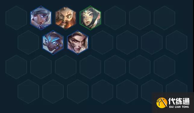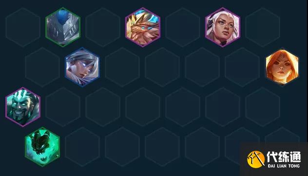 正义巨像—加里奥(4)、德玛西亚之力—盖伦(5)、钢铁少女—芮尔(4)、深海泰坦—诺提勒斯(2)、放逐之刃—锐雯(3)、暗裔剑魔—亚托克斯(1)、 正义天使—凯尔(5)、荣耀行刑官—德莱文(4)、魂锁典狱长—锤石(2)