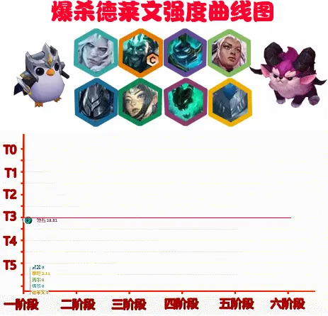 在曲线图中德莱文二星六阶段还能保持接近T0的强度依靠的是装备加持,现在主流前排无非是加里奥、芮尔、刀妹这三种,除了刀妹外剩下两个前排德莱文击杀效率并不慢而且还会比传统体系击杀更快一点。