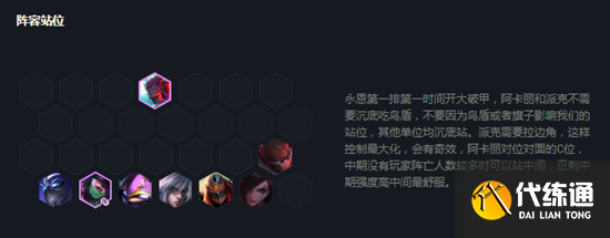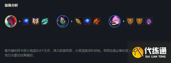 装备要求比较苛刻,成型之后锁血能力超强,吃鸡吃分不在话下,比较怕伏击,有了永恩之后,森林太肉也可以打过,其他阵容均可吊打,站位要求较高,只要把对面拉出来阿卡丽一下一个,阵容强度可吃鸡!大后期克正面刚九五