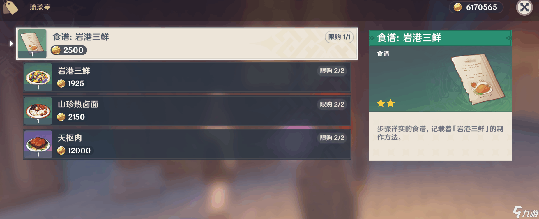 往城内走去,在路的左边首先寻找琉璃亭的璃彩对话。我们就可以看到食谱:岩港三鲜。购买习得食谱制作方法,可以知道其效果是提升全队角色6%-12%的暴击几率。