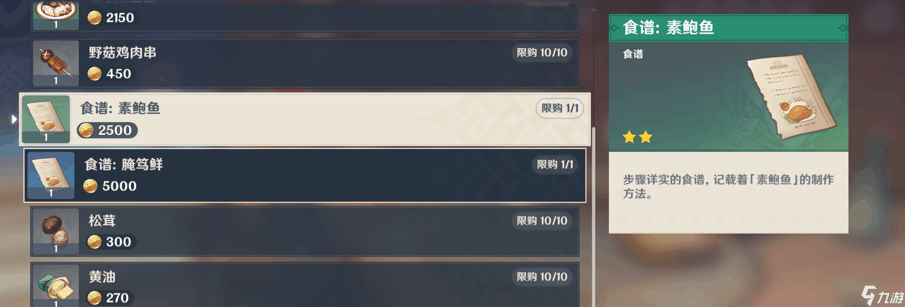 首先我们需要传送到望舒客栈,寻找客栈里的老板娘进行对话,选择我想买些好吃的选项。然后就能在菜单里找到食谱:素鲍鱼和食谱:腌笃鲜,点击购买即可获取两种食谱。两种食谱都有着回复生命值的效果,相比之前的回血食品数值也大大增加。