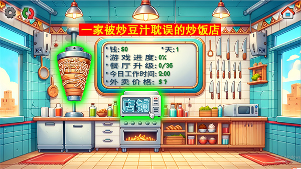 2、然后在店铺中间就可以看到店铺的名字叫:一键被炒豆汁耽误的炒饭店,点击下方的【开始一天】就可以开启挑战;
