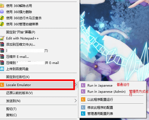 4.接下来找到日文游戏的图标,右键选择【Locale Emulator】——【以此程序配置运行】即可。然后游戏会直接运行,里面的文本也会回归正常的日文显示。