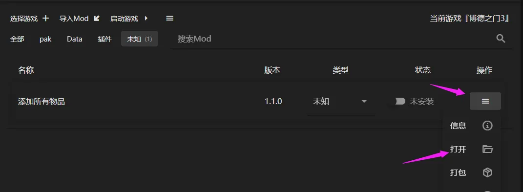 1、当mod的类型在安装时出现未知,可以找到mod列表下最右边的操作下拉框中选择打开找寻mod目录;