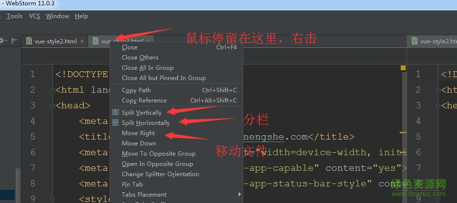 Webstorm垂直分栏,在需要分栏的文件上右击,选着垂直拆分。就可以拖动,形成左右分栏