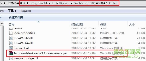 1.打开“webstorm修改补丁”文件夹,将“JetbrainsIdesCrack-3.4-release-enc.jar”文件复制到webstorm安装目录下的bin文件夹中(ps:一定要放对,不然无法继续修改操作了)