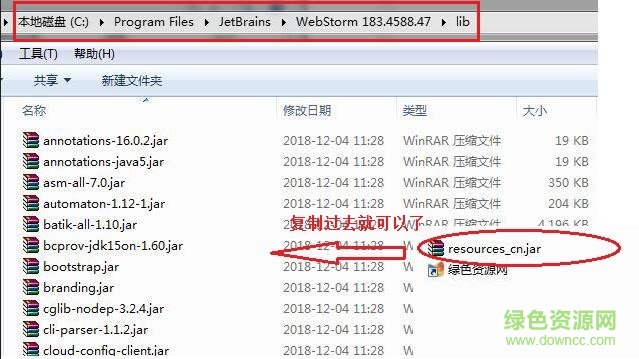 1.找到lib目录下的”resources_en.jar“文件删除(可以先备份,以防汉化失败),将”webstorm汉化包“中的”resources_cn.jar“复制到lib文件夹即可。